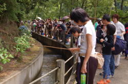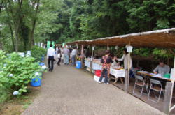 - 多気町丹生地区は平成5年から、地域資源(水や土)の保全や活用を目的に「あじさいいっぱい運動」が行われ、「彦左衛門のあじさいまつり」は「ふるさとの水と土に感謝して」をテーマに平成9年にスタートした。水銀と弘法大師ゆかりの地「丹生大師の里」で、周囲を流れる立梅用水(水)・周辺の田んぼ(土)・1万本以上のあじさいが咲き乱れる緑豊かな資源空間(里)を祭の舞台とした「水土里の祭典」には、毎年1万以上の人々が集い祭を盛り上げる。